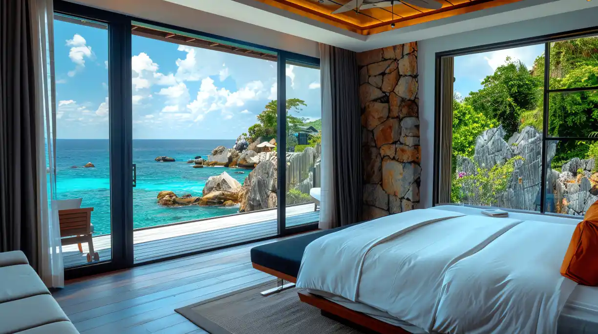 Varied types of rooms, from standard to luxury suites, equipped with essentials like beds.